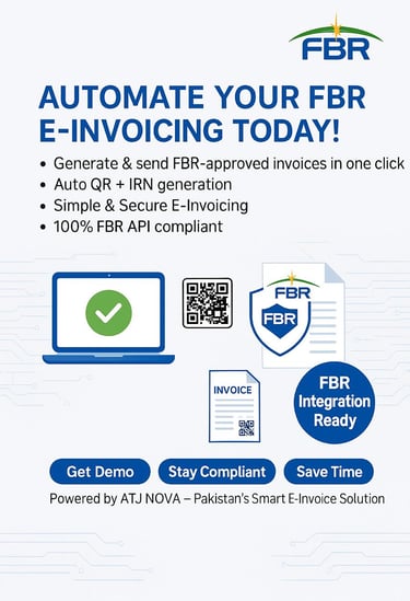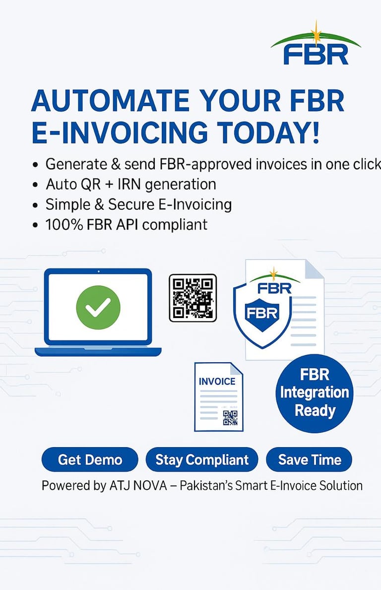ATJ NOVA’s FBR Digital Invoicing Solution is a world-class platform designed to bring your business into full compliance with the Federal Board of Revenue (FBR) regulations — efficiently and securely.